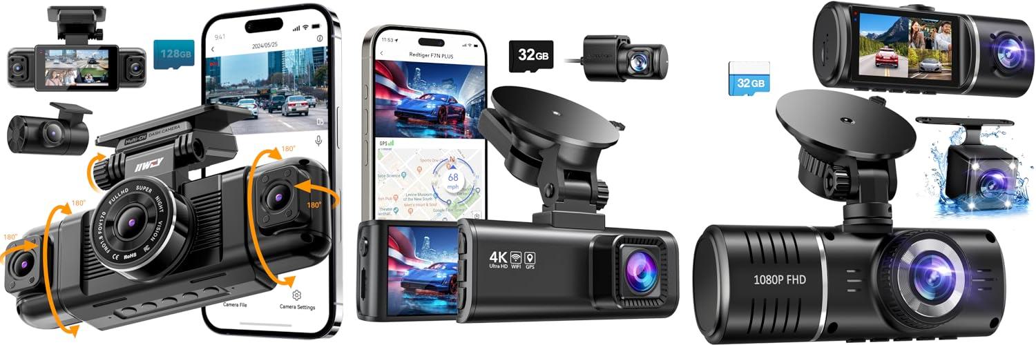 The Dash Cam Front and Rear Inside, 3 Channel Dash Camera for Cars is a great way to keep your car safe. It has three cameras: one for the front, one for the cabin, and one for the back. This dash cam records in 1080P, so you can see everything clearly. It also has a 32GB card, loop recording, and HDR. The G-sensor helps protect your car while parked.