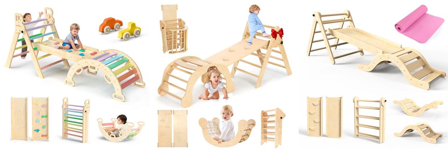 1. BlueWood Pikler Triangle Set 7in1 Foldable Baby Climbing Toys Wooden Montessori Climbing Set with Arch&Ramp&Ladder Baby Climber Indoor Jungle Gyms for Toddlers Montessori Toys – Rainbow