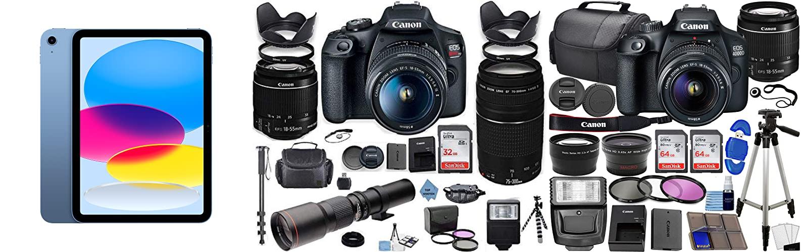 The Canon EOS 4000D / Rebel T100 is a DSLR camera. This bundle comes with many accessories. It includes lenses, memory, and a flash. This renewed camera is a good choice for new photographers. It is a good way to learn about photography.